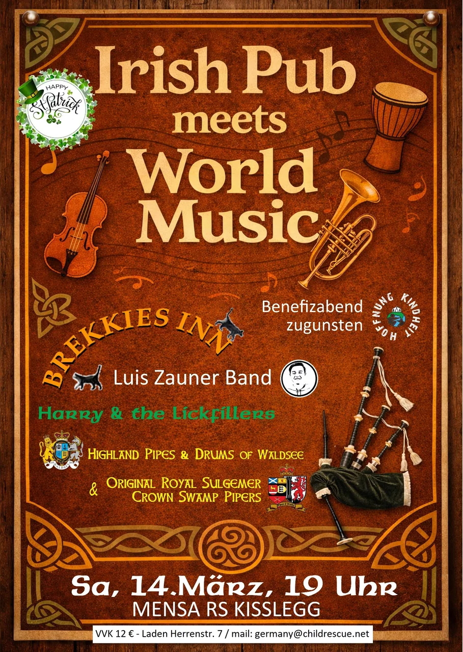 Der Verein Hoffnung Kindheit e.V. – El Shaddai lädt am Samstag, 14. März 2026, zu einem besonderen Konzertabend in den Pop Up Irish Pub in der Mensa des Schulzentrums Kißlegg ein. Unter dem Motto „Irish Pub meets World Music“ treffen unterschiedliche Musikstile, Kulturen und Klangfarben aufeinander und verschmelzen zu einem abwechslungsreichen Live-Erlebnis. Beginn der Veranstaltung ist um 19 Uhr.